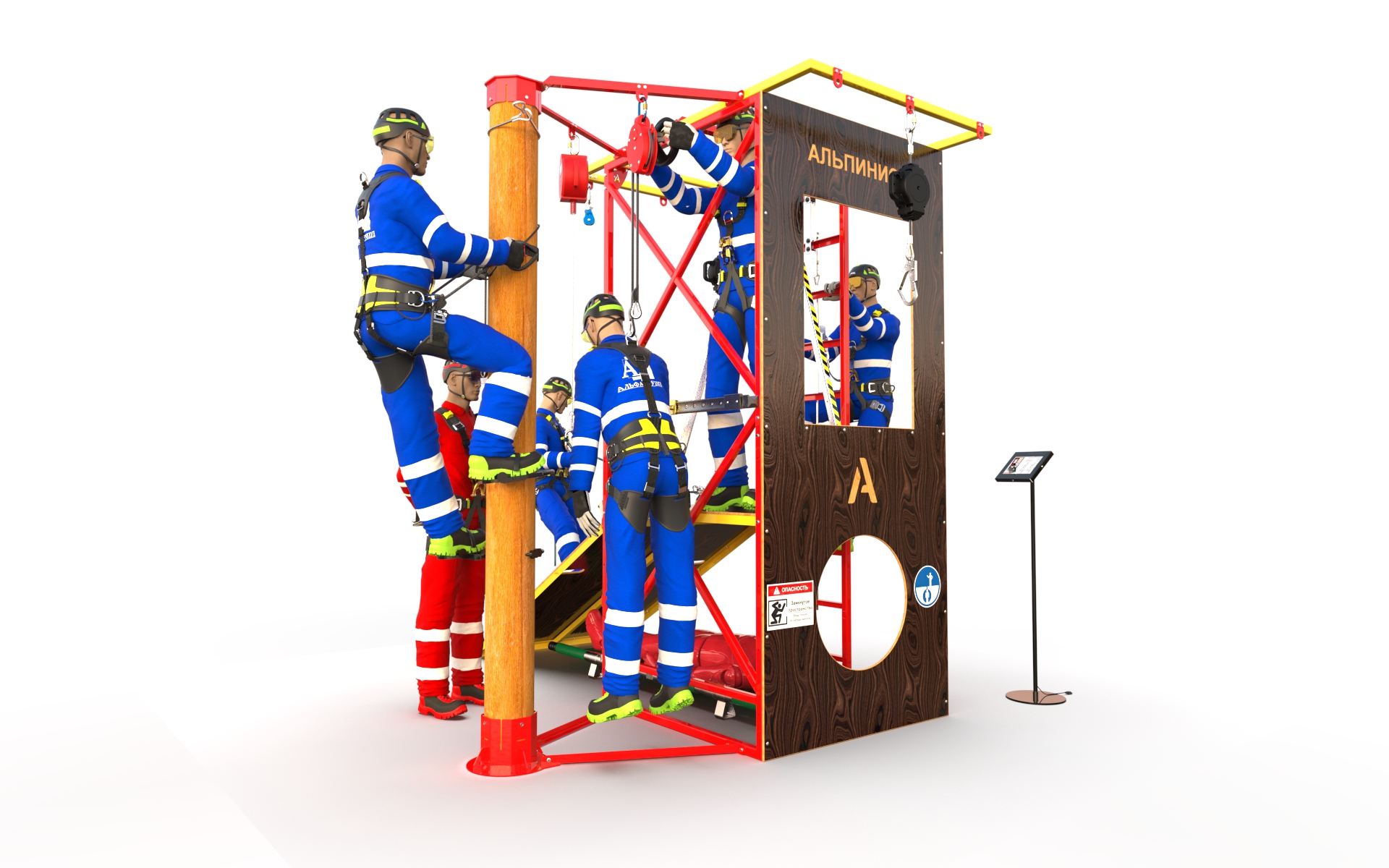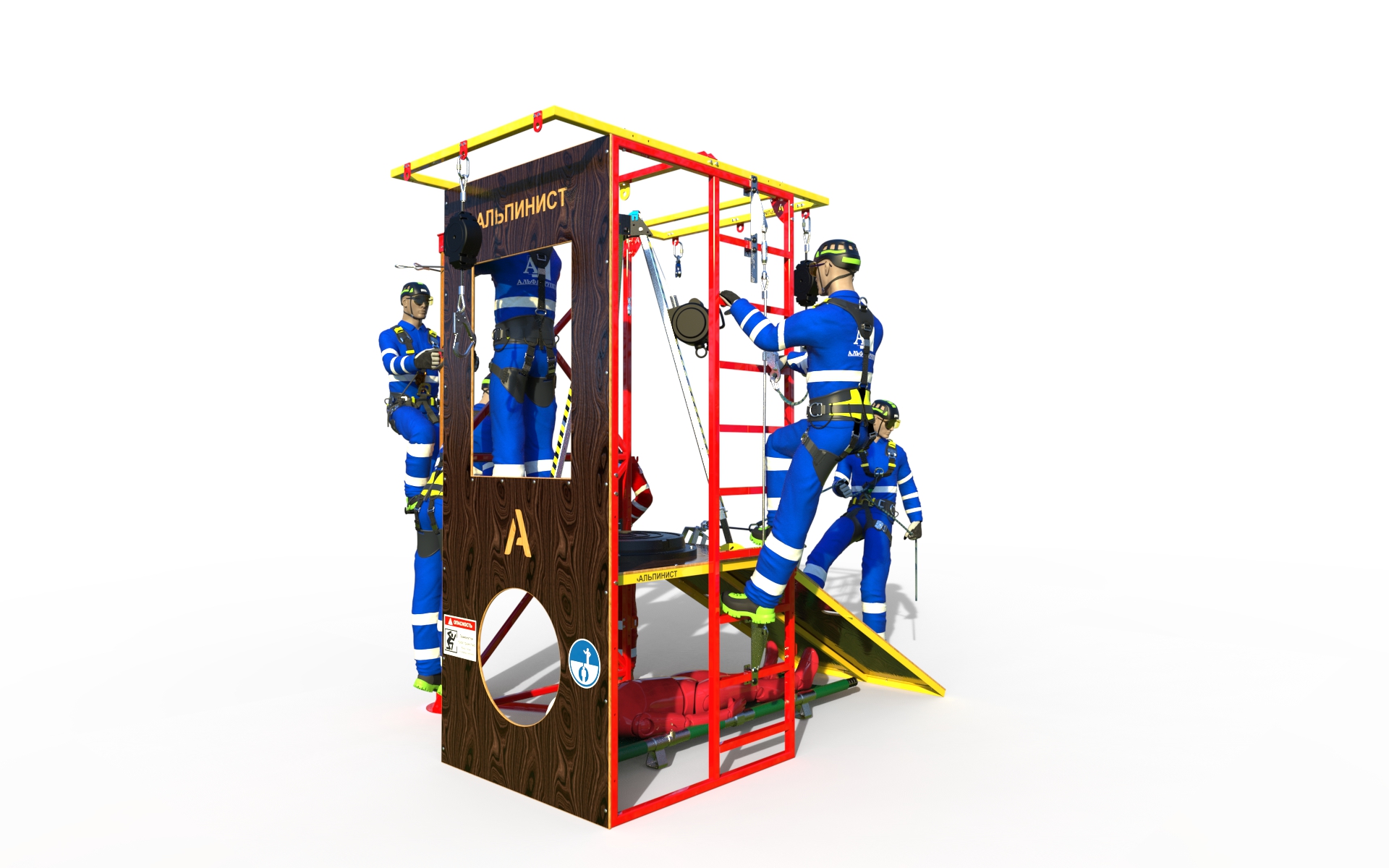 Тренажёр «Альпинист» предназначен для отработки навыков работы на высоте в учебных классах и центрах. Он представляет собой бюджетную и функциональную учебную конструкцию, которую можно легко транспортировать и устанавливать в различных местах для обучения сотрудников предприятий.